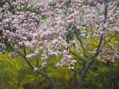 Pink magnolia and forsythia